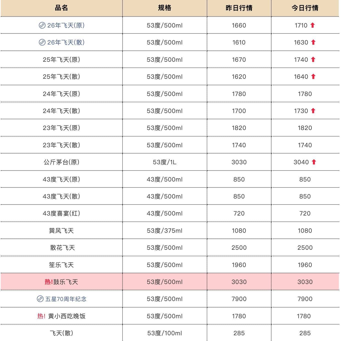 其中,26年飞天茅台原箱较前一日上涨50元,报1710元/瓶;26年飞天茅台散瓶较前一日上涨20元,报1630元/瓶。25年飞天茅台原箱较前一日上涨70元,报1740元/瓶;25年飞天茅台散瓶较前一日上涨20元,报1640元/瓶。