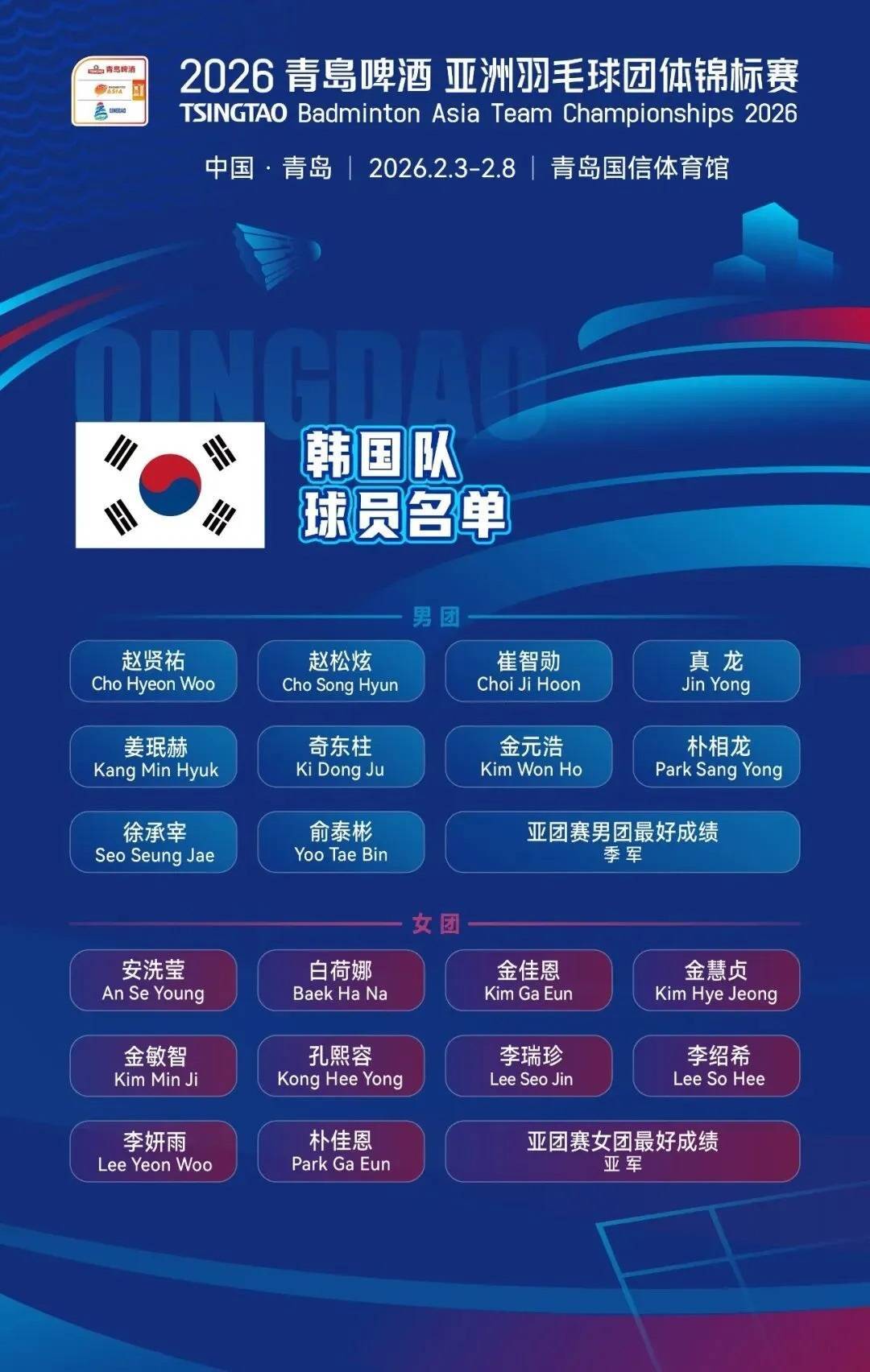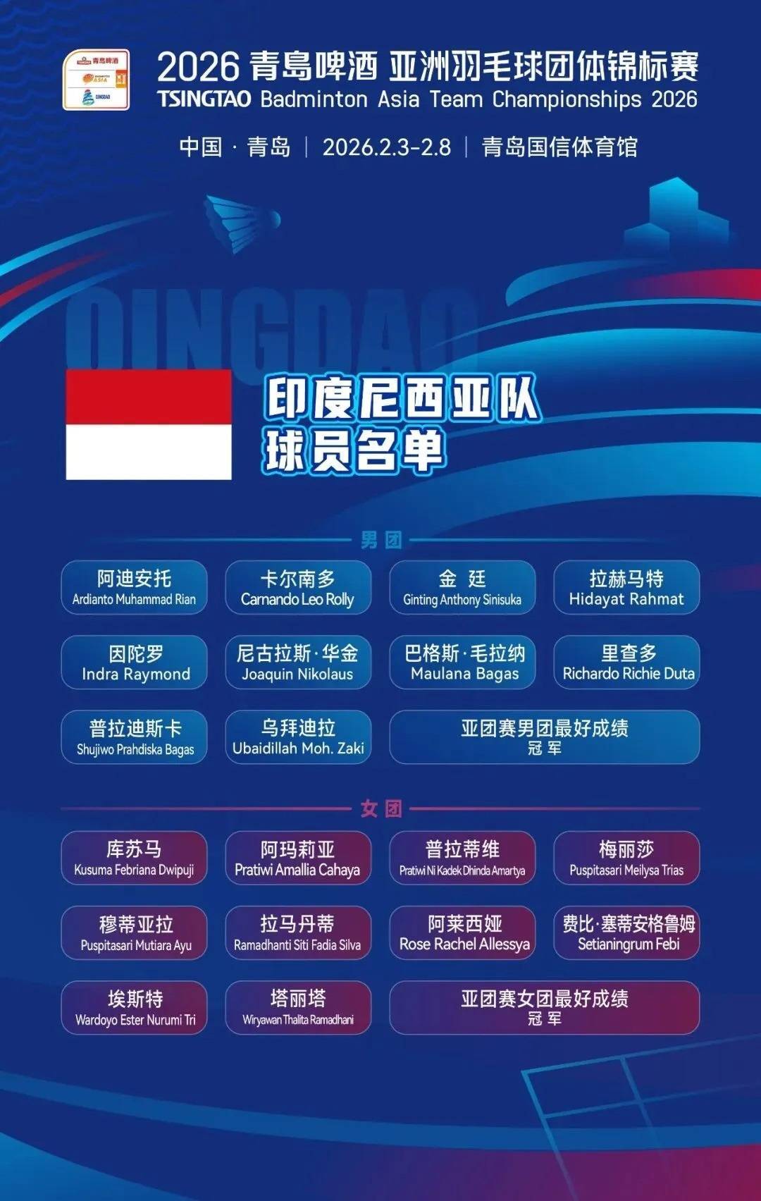 r2026青岛啤酒亚洲羽毛球团体锦标赛的大幕即将拉开,各路强队的最终名单现已悉数出炉。作为亚洲羽坛开年的顶级大考,这场集结了奥运冠军、世锦赛金牌得主及多位世界顶尖选手的团体对决,已让青岛赛场的硝烟味渐浓。