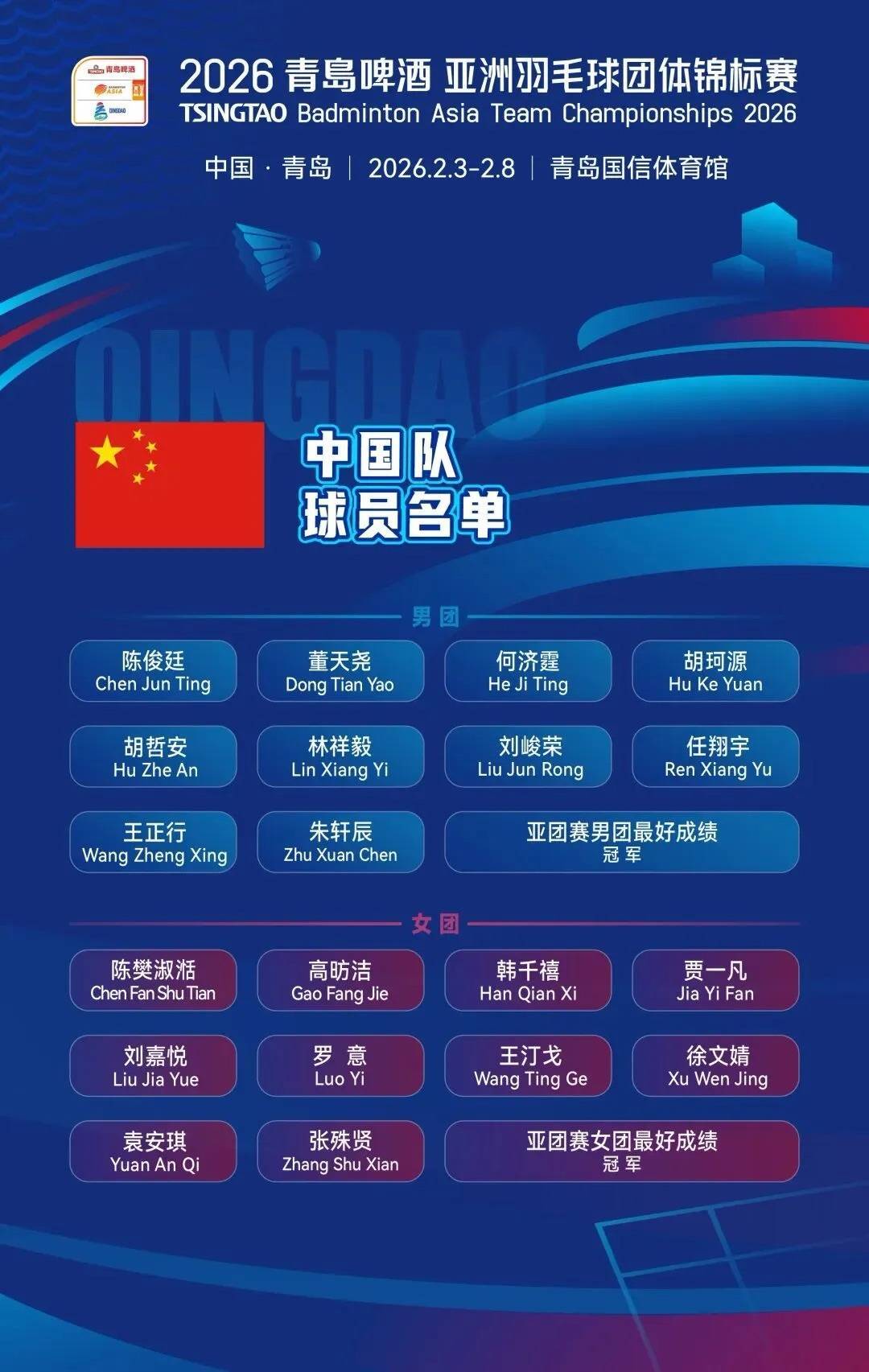 r坐镇主场的中国队本次由四届世锦赛冠军、奥运冠军、同时也是本届赛事形象大使的贾一凡搭档张殊贤领衔女双阵线,旨在通过顶尖老将的实战经验带动队伍。刚刚随队夺得羽超冠军的双打选手何济霆,以及世界排名第29位的王正行、女单名将高昉洁、韩千禧等精锐也悉数入选。