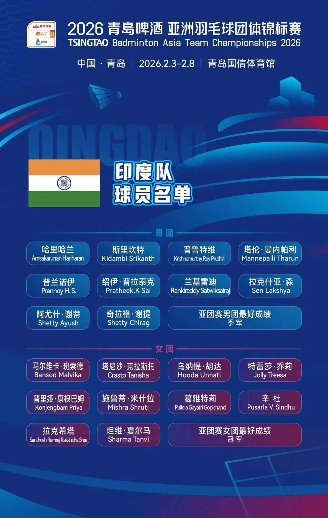r印度队此次派出的阵容也含金量十足,阵容中包含了多位世界级明星球员。奥运奖牌得主辛杜与世锦赛男单季军拉克什亚的入选,确保了印度队在女、男单打线上的威慑力。而今年与“梁王组合”多次正面对抗的男双“黑塔组合”兰基雷迪/谢提,则将以极具侵略性的进攻球风,为本次亚团赛增添更多的强力对抗色彩。