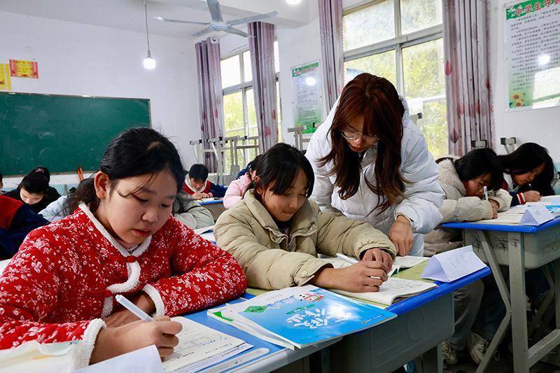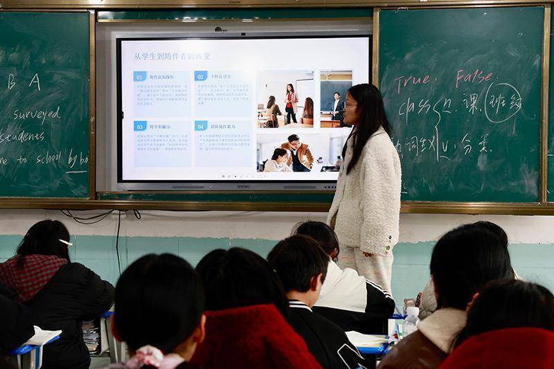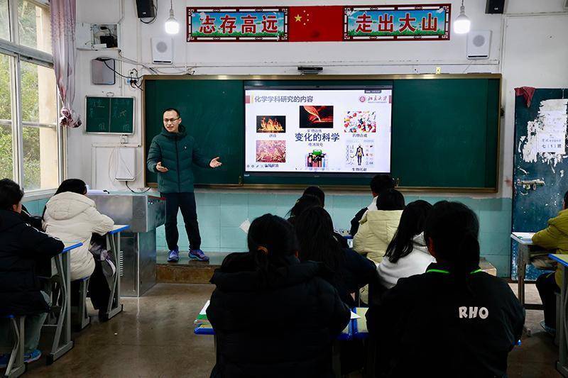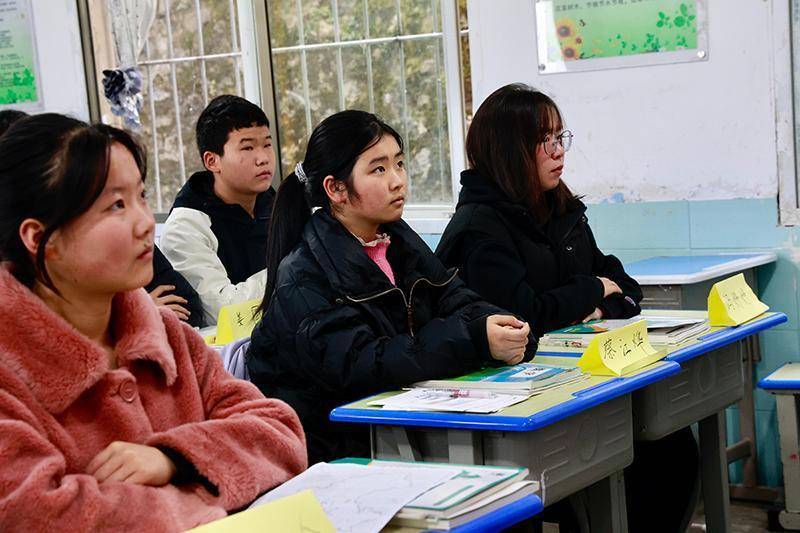 龙井中学教室内暖意融融,书香弥漫。孩子们坐姿端正,目光专注地追随着讲台上的“小老师”。支教团员们结合自身成长与求学经历,通过生动实例和通俗讲解,将复杂知识转化为易懂内容。课堂上,孩子们时而凝神聆听,时而低头记录,志愿者耐心解答的声音与之交织,构成一幅寒冬校园里充满生机的学习画卷。